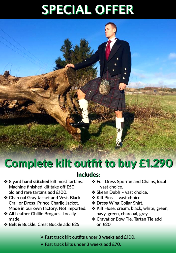 - 8 yard hand stitched kilt most tartans. Machine finished kilt – take off £50. Old and rare tartans add £100